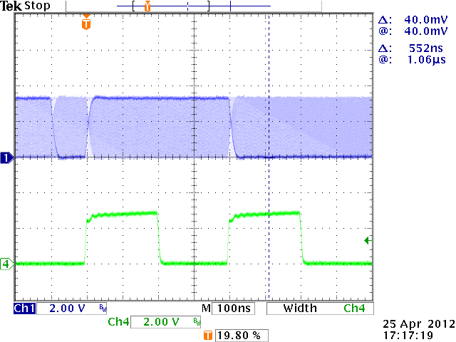 With the clock set to 80MHz, the signals are 4x faster – the strobe high and low times become 50nS. The minimum peaking time @ 80MHz is 50nS, so the minimum idle time between events is also 50nS.